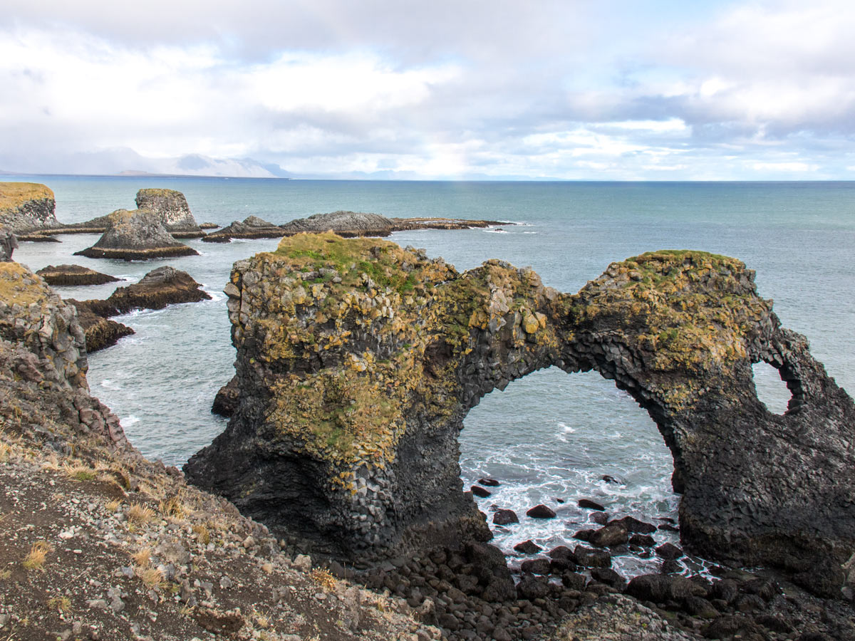 Vom Parkplatz gut sichtbar, wird man von der Bárðar Saga Snæfellsáss Statue (Saga des Bárður, dem guten Geist vom Berg Snæfell) empfangen. Von hier läuft man ein paar Minuten linker Hand, bis man den bemoosten und manchmal von wilder Brandung umtosten Lavasteinbogen Gatklettur 64°46'04.0"N 23°37'03.3"W Vom Aussichtspunkt könnt ihr entweder ein Stück weiter geradeaus zum Hafen spazieren oder ihr wendet und beginnt die beeindruckende Küstenwanderung nach Hellnar. Vom Aussichtspunkt sind es ca. 3 km (einfach) entlang der Klippen. Weitere Informationen zur Wanderung und den Sehenswürdigkeiten findet ihr im Blogbeitrag: Arnarstapi