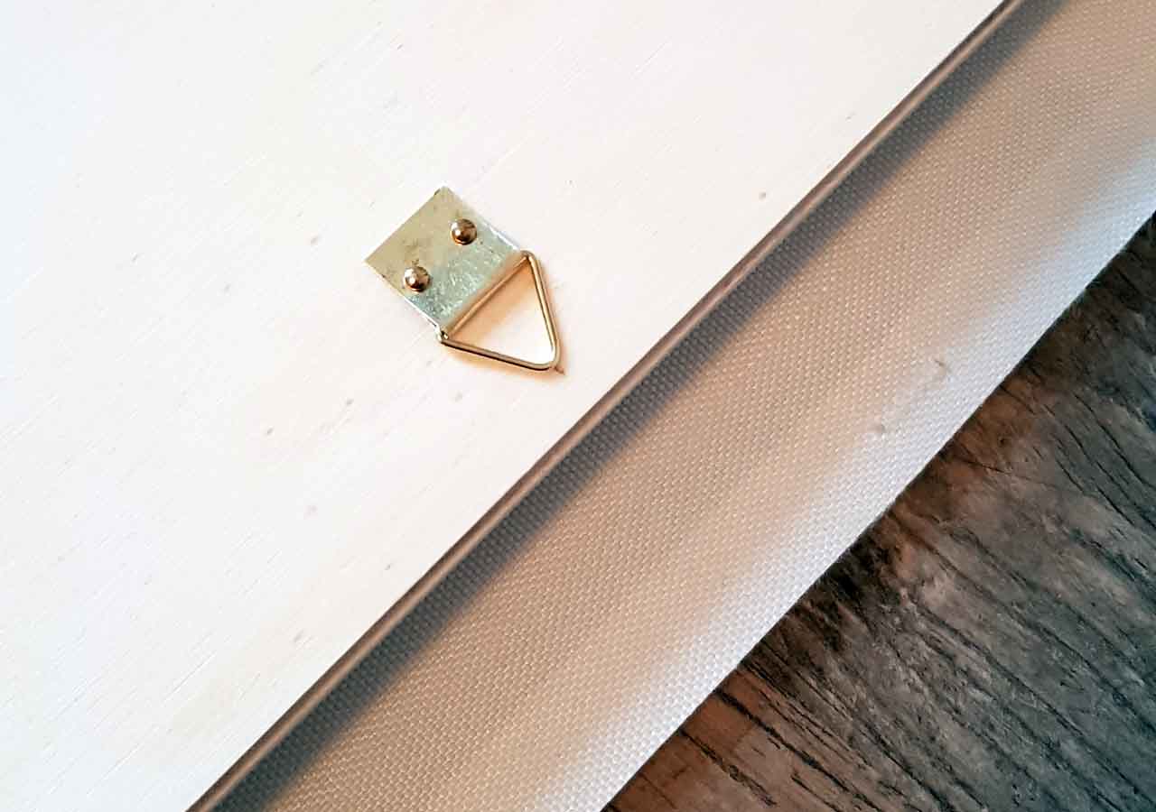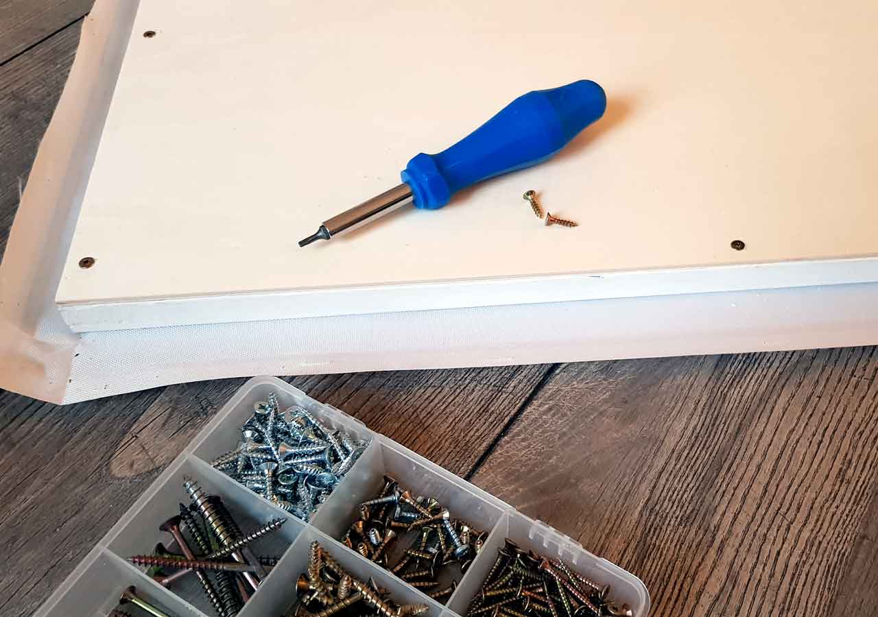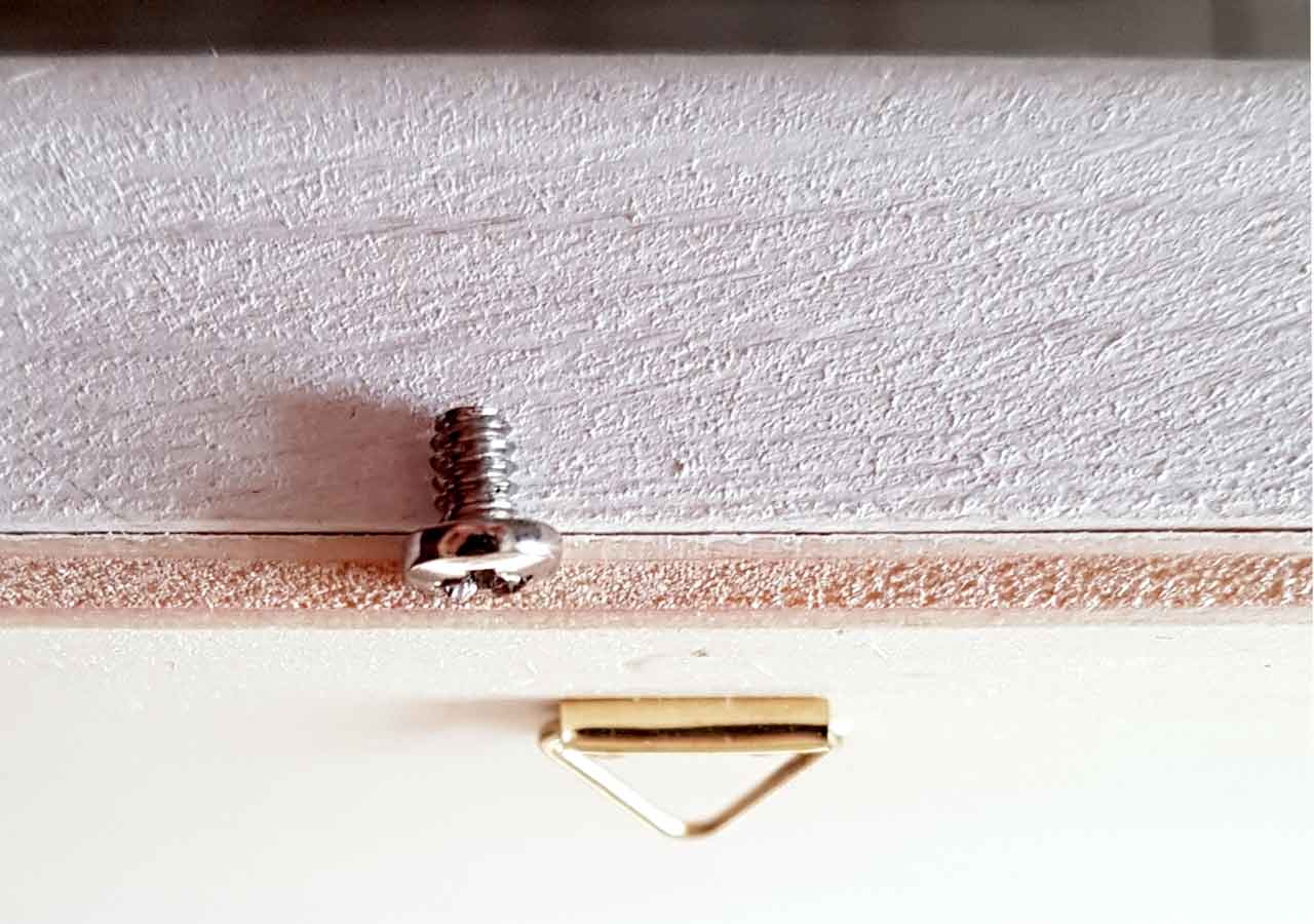 Nach dem Trocknen verschraubte ich mit 10 Holzschrauben die Rückwand fest mit dem Rahmen. Die Bildaufhänger wurden an die obere Bilderleisten genagelt und schon konnte das Board an die Wand.