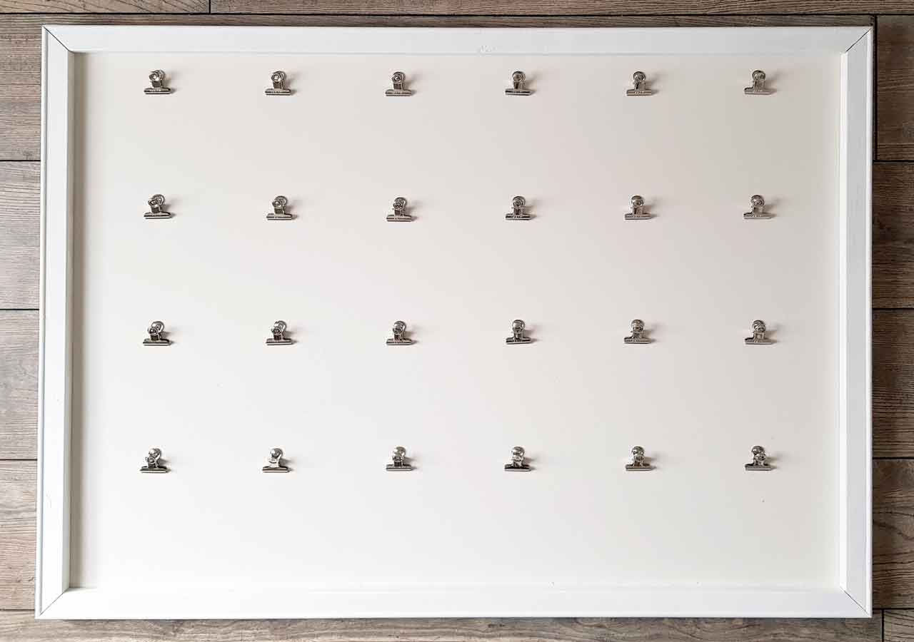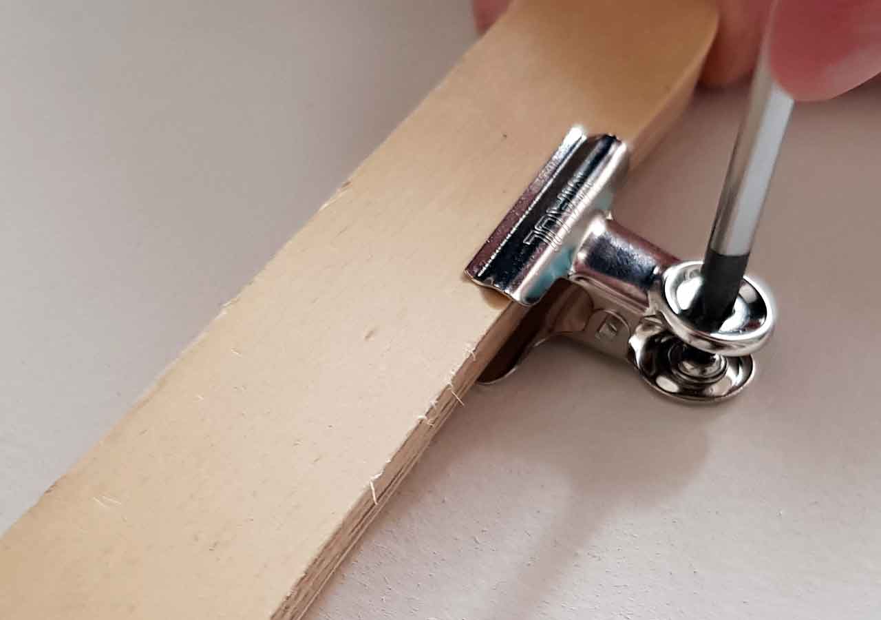 Für meinen Kalender habe ich die Briefklemmer von Maul mit einer Breite von 3 cm (Packung à 10 Stück) verwendet. Billiger geht es z.B. mit den 30 Foldback-Klemmen oder ihr verwendet einfach Wäscheklammern aus Holz und klebt diese mit einer Heißklebepistole auf. Wenn ihr Euch für den Einsatz von Metallklemmen entscheidet, sind noch ein paar Herausforderungen zu bewältigen: