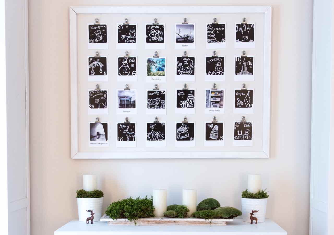 Echte Polaroids haben ein schwarzes Feld auf der Rückseite. Diese Optik wollte ich für die Nummerierung sowie weihnachtliche, isländische Bilder nutzen. Mit einem schwarzen Stift zeichnete ich meine Motive auf weißes
