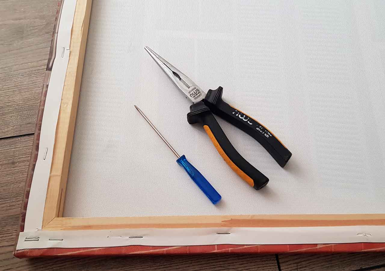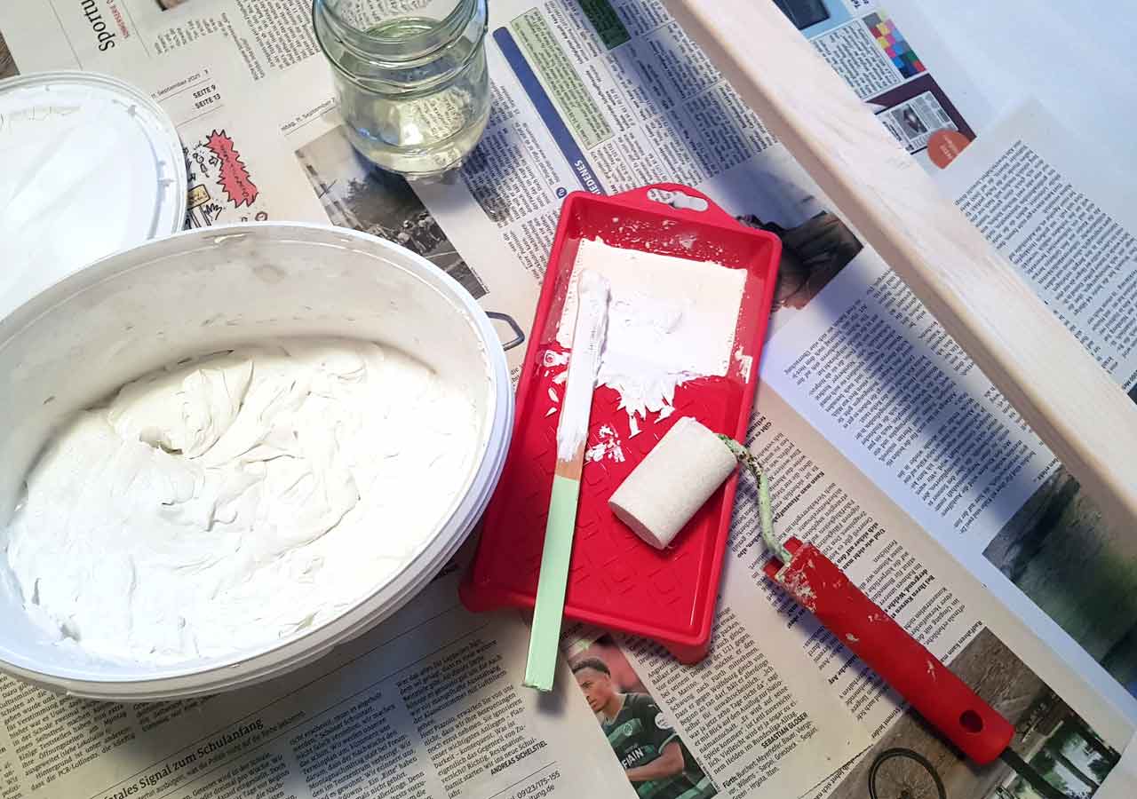 Passend zum Rahmen besorgte ich mir aus dem Baumarkt eine dünne, 75x100x3 mm Sperrholzplatte als Rückwand. Die vorhandene Leinwand entfernte ich, schloss die vorhandenen Löcher und Ritzen mit etwas Spachtelmasse und begann mit den Malerarbeiten. Damit die Holzstruktur noch leicht durchschimmern kann, strich ich den Rahmen passend zur Einrichtung dünn mit weißer Dispersionsfarbe. Für die Rückwand wählte ich die Wandfarbe. Das Ganze sollte nicht zu mächtig werden, sondern sich unauffällig integrieren.